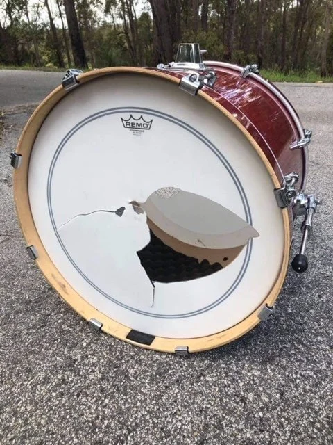 Back in 2021, we played a hometown Perth show at Jack Rabbit Slims. Was one of our first sold out shows and we were buzzing. Few beverages, everyone was ready to go. But Nathan after about 3 songs put a hole straight through the kick drum! He then played half the set without kick and used a combo of the floor Tom and praying to God. Got it done though and was a great gig! Here’s the aftermath the day later.