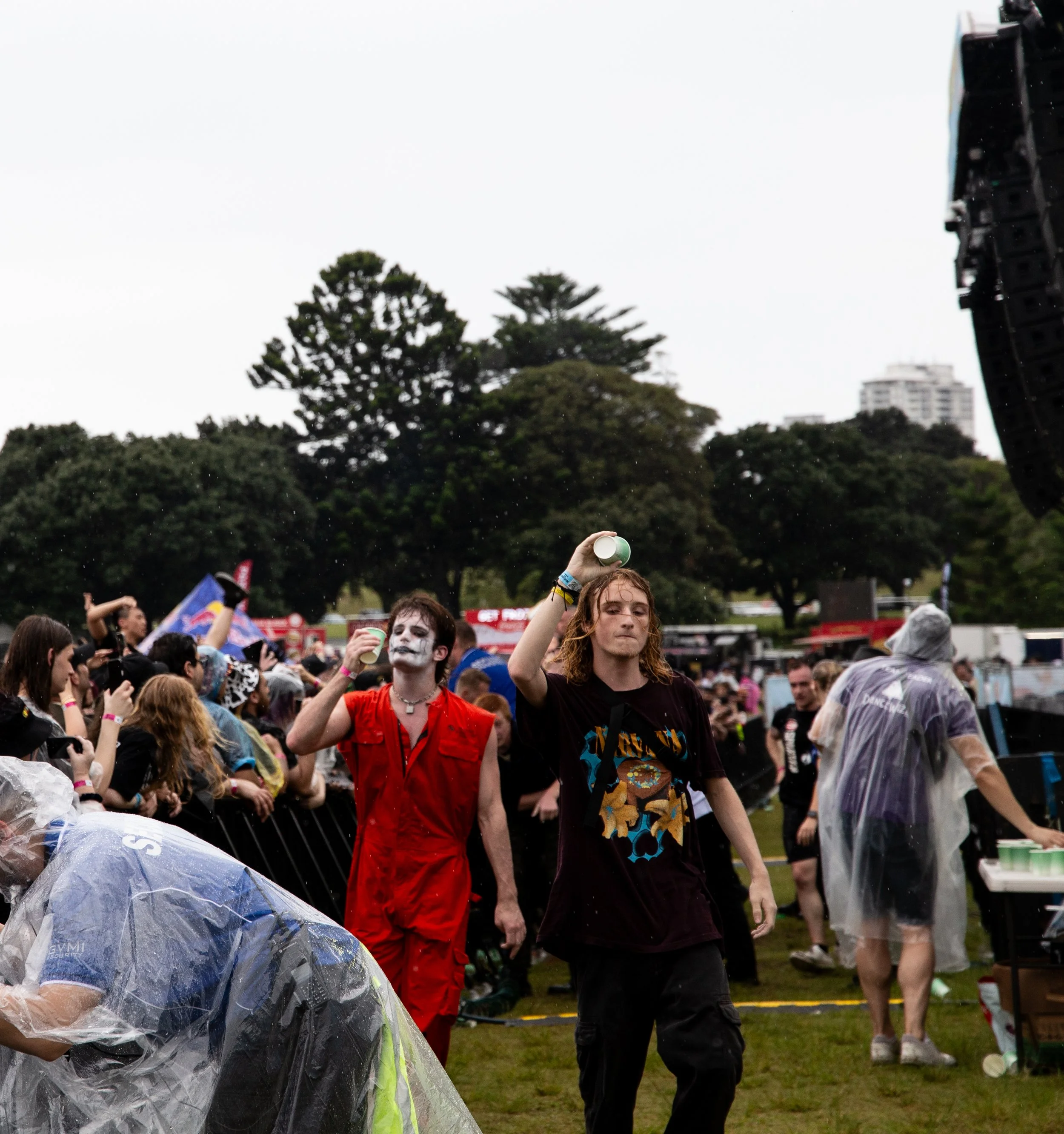 The heavens sure did open up and let it pour down in Sydney on the 7th of December, but that didn’t deter festival goers as they all lined up waiting for the gates to open at Centennial Park. Excitement filled the air as everyone started to head into the grounds singing out lyrics to Korn’s “Ya’ll Wanna Single” and a sea of rain ponchos started to fill up park as they either set out to grab some merch, flocked to the bar, or run for cover as the rain started to come down even heavier than before. Despite the rain and the humidity, it seemed to have little effect on the crowd as shirts came off in the mosh pits, mud fights were happening at the back, and people were just happy to be there witnessing some great live music and fun.